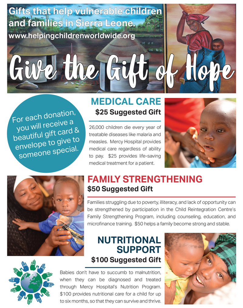 This holiday season, honor someone with a gift that helps vulnerable children and families in Sierra Leone. For your donation, you will receive a beautiful gift card to give to your friend or family member.